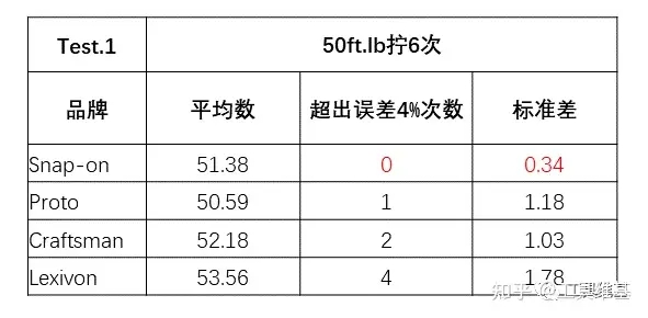 測(cè)試1的結(jié)果:匯總數(shù)據(jù)后我們第一反應(yīng)是都不用做后面幾項(xiàng)測(cè)試了,第一項(xiàng)測(cè)試已經(jīng)拉開了差距,所有指標(biāo)上最貴的Snap-on都遙遙領(lǐng)先,雖然第一眼看平均數(shù)上Snap-on不是第一名,但每次離50都很近(標(biāo)準(zhǔn)差最小),而其他的扳手除了重復(fù)性會(huì)低之外,還有超過4%誤差的結(jié)果。